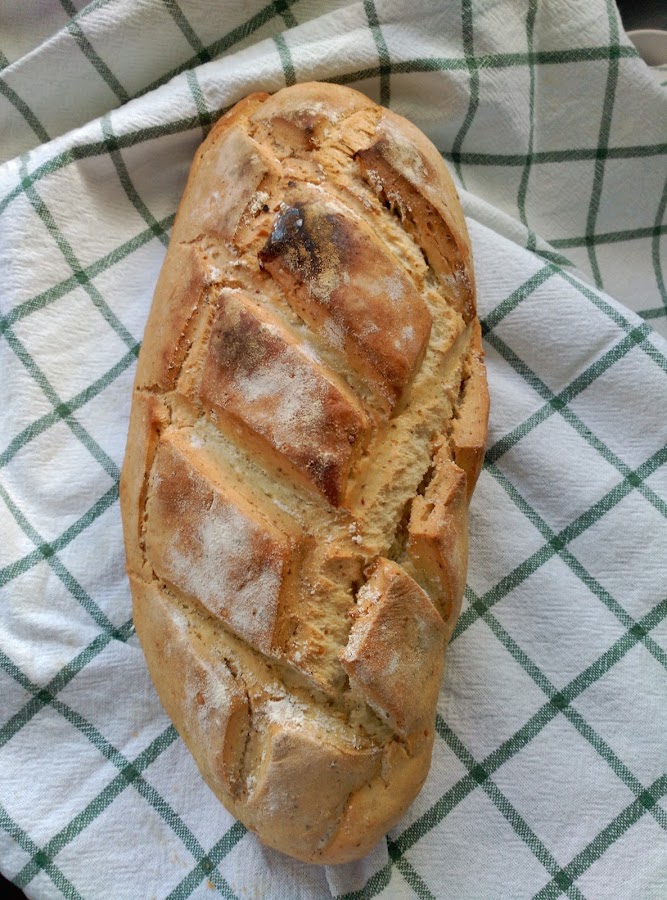 8.- Coloca un bandeja en la parte baja del horno con un poco de agua y pon la rejilla a media altura. Coloca la bandeja con el pan sobre la rejilla y hornea 10 minutos a 250º. Ahora baja la temperatura a 200º y sigue durante 40 minutos mas.