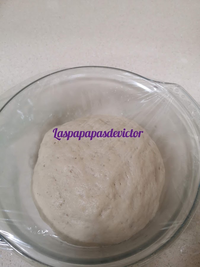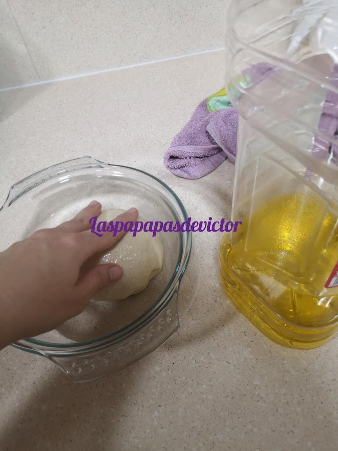 Formamos una bola y le añadimos aceite y la dejamos descansar unos 30 min tapado en plástico film