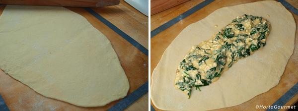 Una vez enfriada la masa, la sacamos del frigorífico y nos ponemos con el relleno y el montaje de este sabroso pan. Encendemos el horno y precalentamos a 200 ºC.Primero, lavamos y secamos las espinacas y pelamos y picamos el ajo bien fino, eliminando el corazón. Luego, ponemos una sartén pequeña al fuego y derretimos la cucharada de mantequilla. Incorporamos el ajo, lo doramo y añadimos las espinacas. Saltearemos las verduras hasta que hayan perdido casi todo el agua. Después, las retiramos del fuego y las dejamos atemperar.