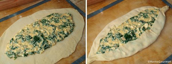 Después, sobre una hoja de papel vegetal o silicona, vamos a extender nuestra bola con un rodillo para darle forma de óvalo, no muy gruesa. Ahora, disponemos el relleno en línea recta por el centro del óvalo. Lo extendemos un poco más hacia los laterales, pero dejando suficiente espacio para plegar los bordes del pan de queso.Plegamos los bordes hacia el interior, formando una especie de barco y pellizcamos las puntas para sellarlas. Si optas por barnizar el Khachupuri, hazlo en este momento. Horneamos el pan de queso a 200 ºC durante 15 minutos.