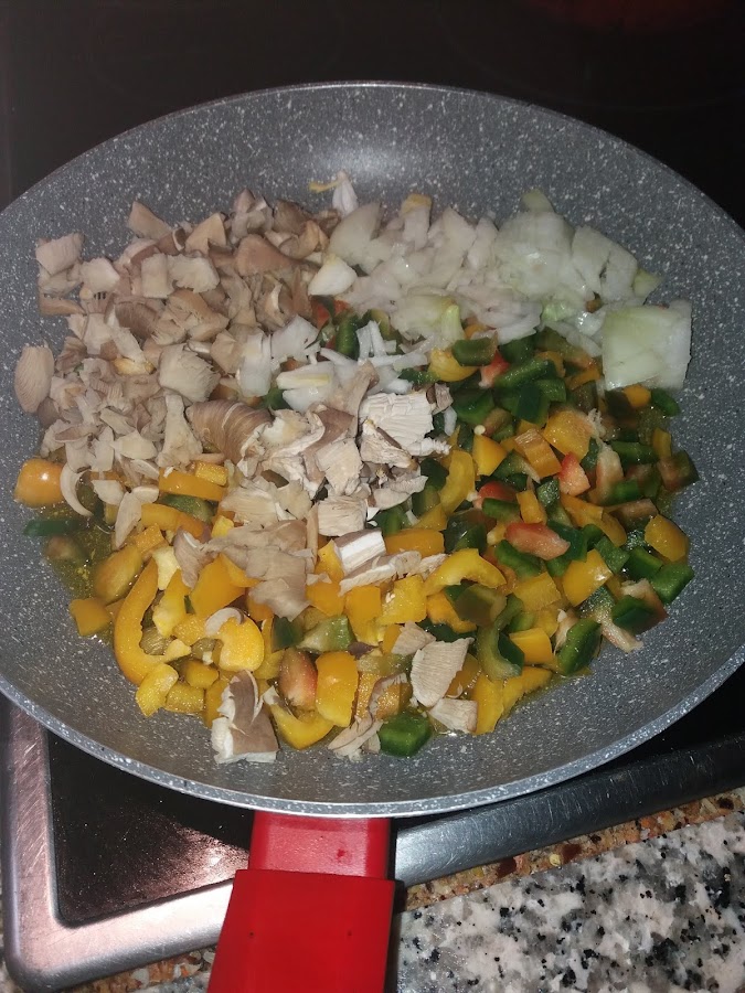 A continuación troceamos los ingredientes en trocitos pequeños,los ponemos una sartén con unas cucharadas de aceite, se dejan hasta que estén bien sofritos y se reservan
