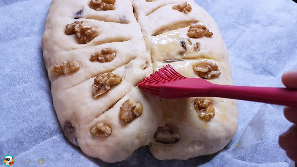 3.- A continuación: hacemos unos cortes a la masa de pan, disponemos encima algunas nueces. Pincelamos la masa de pan de ron con frutos secos con un poco de miel y mantequilla derretida. Cocinamos el pan el horno 35 minutos con el horno precalentado a 180º. Retiramos el pan del horno, dejamos que se enfríe sobre una rejilla.