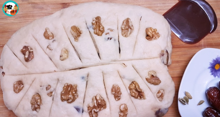 2.- Añadimos las nueces troceadas, los dátiles cortados en trozos medianos y los granos de las semillas de cardamomo. Seguimos amasando hasta que todo se integre bien con la masa. Le damos forma de pan con las manos a la masa. Dejamos reposar la masa 30 minutos en un lugar cálido y limpio, sobre una bandeja cubierta por papel de horno.