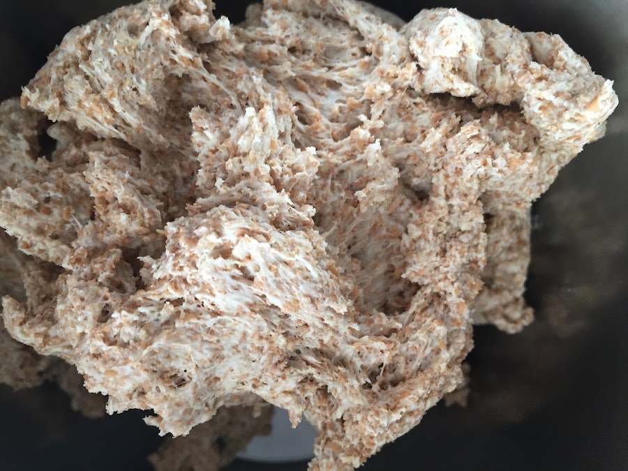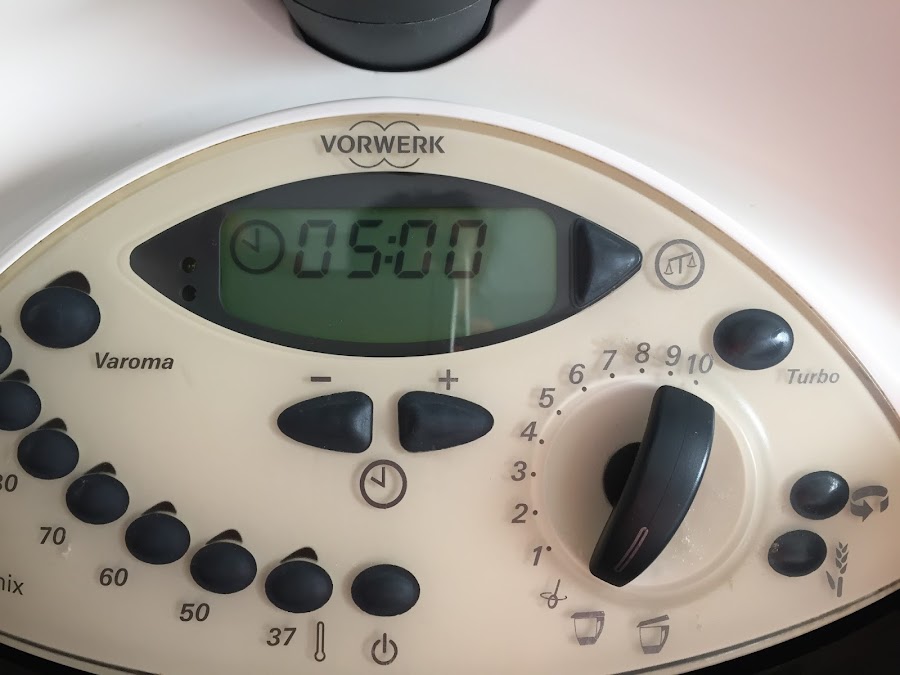 Agregamos el agua y ponemos 5 minutos, vaso cerrado, velocidad espiga para que amase. En éste caso lo mezclamos bien y amasamos .