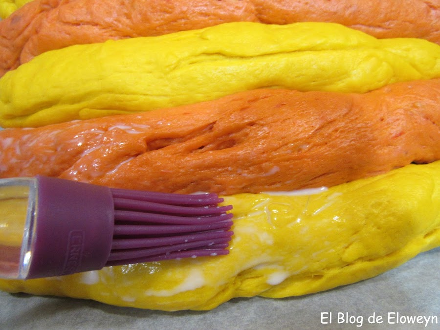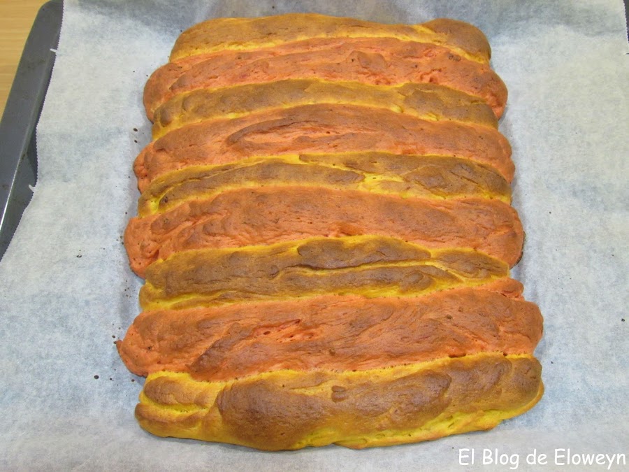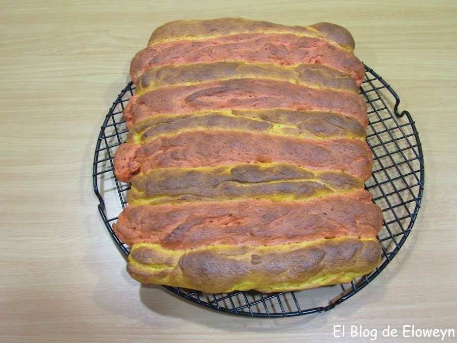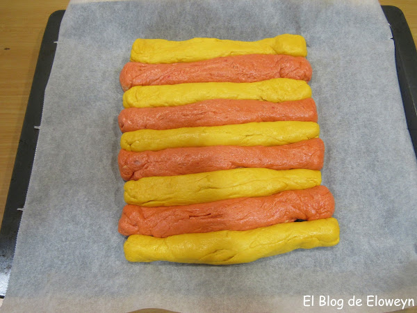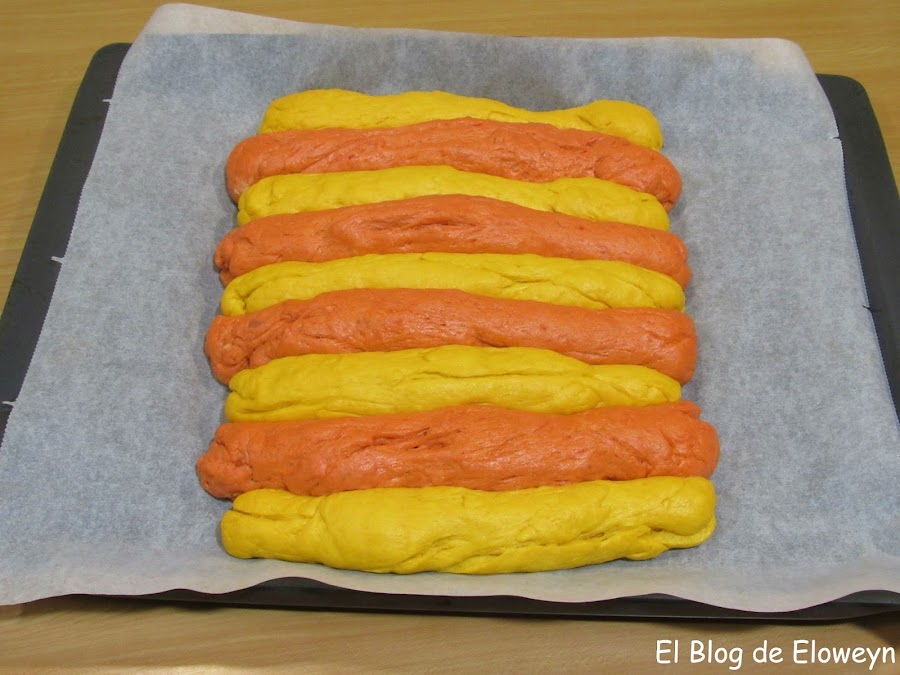 Una vez hecho este pan, cuando se corta, se puede ver la senyera. Siempre hace gracia cuando tienes invitados. Si no sois de Cataluña, también lo podéis hacer. No hace falta que hagáis la senyera. Podéis hacer la bandera de España, si queréis. Los colores son los mismos, y el pan está delicioso. Sólo tenéis que poner en medio la masa amarilla y dividir en dos la masa roja y ponerla en los extremos.