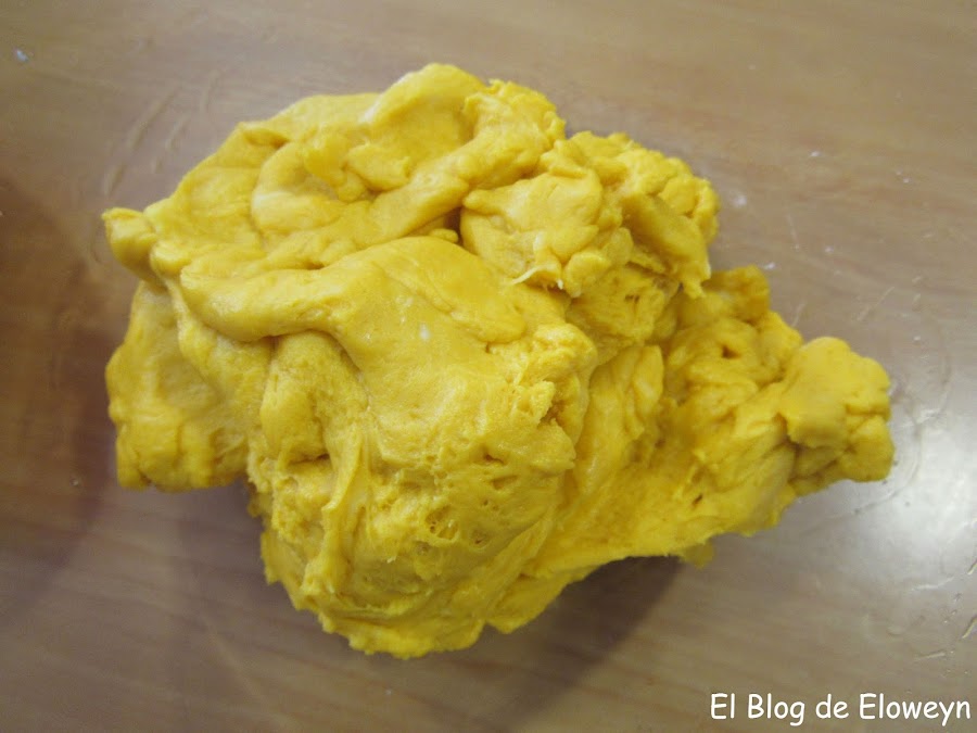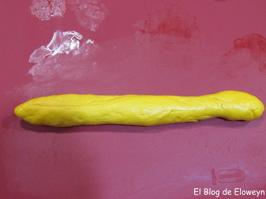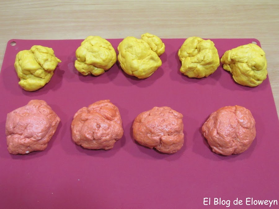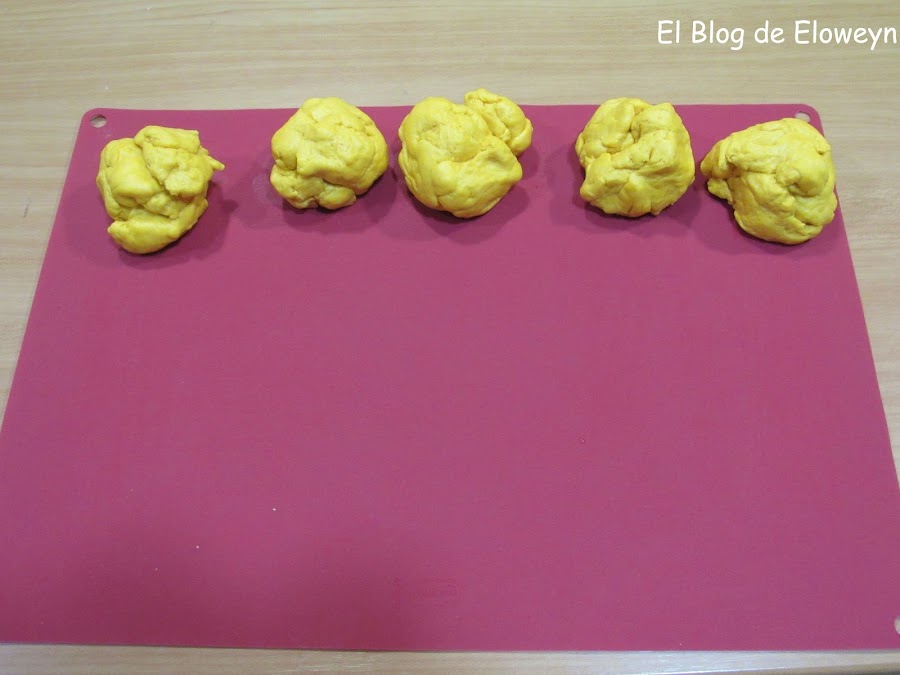 Dividimos la masa amarilla en cinco partes que pesen lo mismo. En mi caso, la masa amarilla pesaba 536 gramos. Cada una de las bolas pesaba unos 107 gramos más o menos.