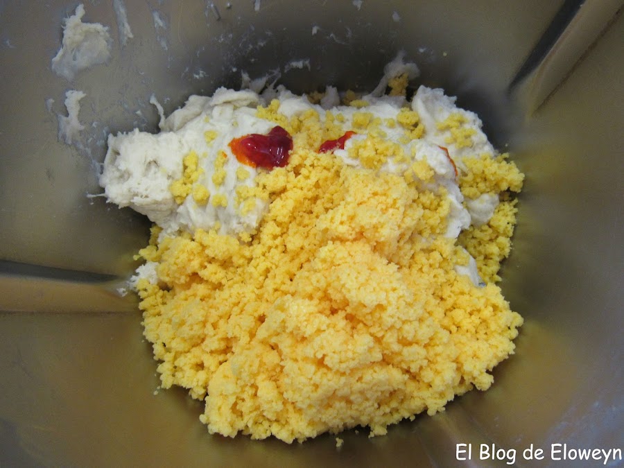 Si se desea, añadir el colorante rojo. Como he dicho antes, si añadís el colorante, mejor poner poco. Más vale quedarse corto que pasarse. Programar 1 minuto a velocidad espiga. Si cuando acabe el minuto no está bien mezclado o nos hemos quedado cortos de colorante, añadir el colorante (en el segundo caso) y programar otro minuto a velocidad espiga.