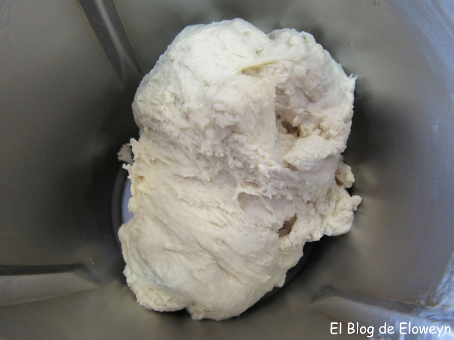 Mezclamos 15 segundos a velocidad 6. Seguidamente, amasamos durante 3 minutos, velocidad espiga.