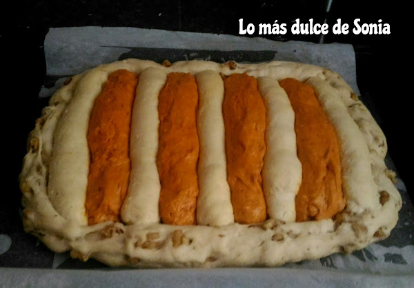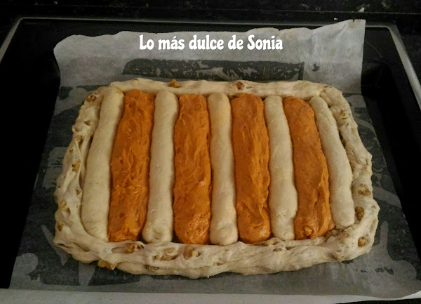 Damos forma al pan, haremos 4 tiras de masa de sobrasada, 5 tiras de queso y una larga de masa de nueces para que de toda la vuelta alrededor del escudo.