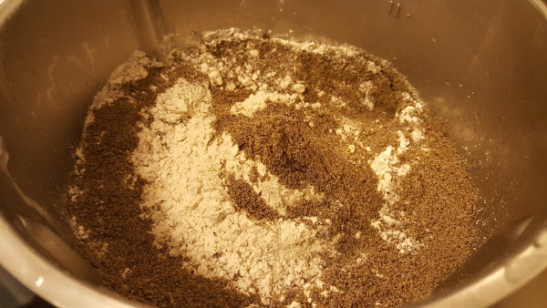 2.- Añadimos las harinas, la chía y la sal y amasamos 20 segundos, velocidad 6.