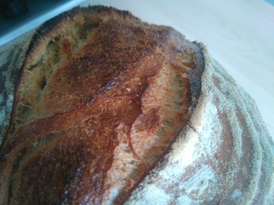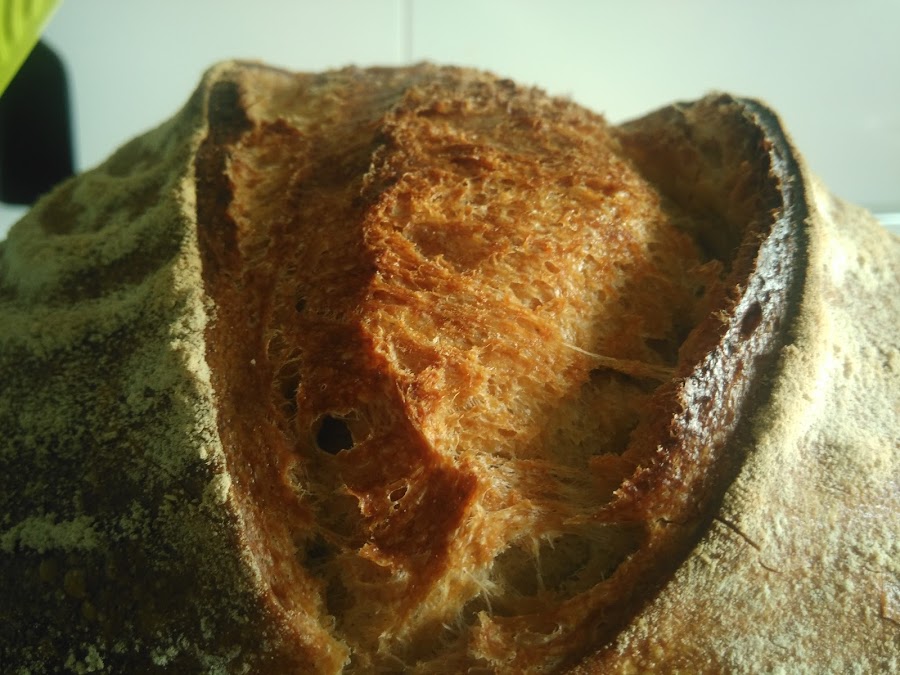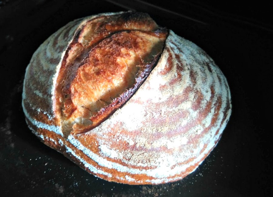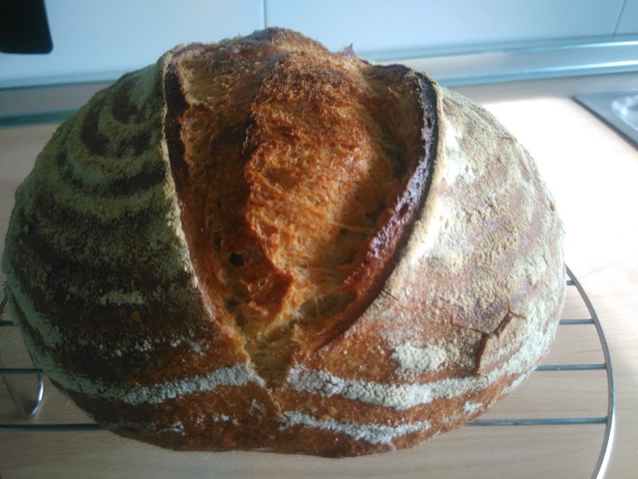 Pasados estos 15 min, abrimos la puerta para que salga el vapor, retiramos la bandeja con piedras, cerramos, seleccionamos calor arriba y abajo y bajamos la temperatura a 210º. Cuando veais que tiene el color deseado, bajar el horno a 190º (si veis que se sigue dorando lo podeis cubrir con papel de aluminio). Hornearemos en total durante 40-45 min (Si teneis termometro sonda, podeis pinchar, el pan estará listo cuando el interior alcance la temperatura de 95º).