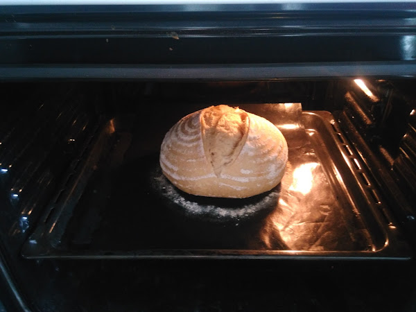 Seleccionamos calor solo abajo, introducimos la hogaza con cuidado, vertemos el vaso de agua en la fuente con las piedras y cerramos el horno rapidamente. Mantendremos de esta manera el horneado durante los primeros 15 min. Cuando lleve la mitad, volvemos a añadir mas agua a las piedras para generar mas vapor.