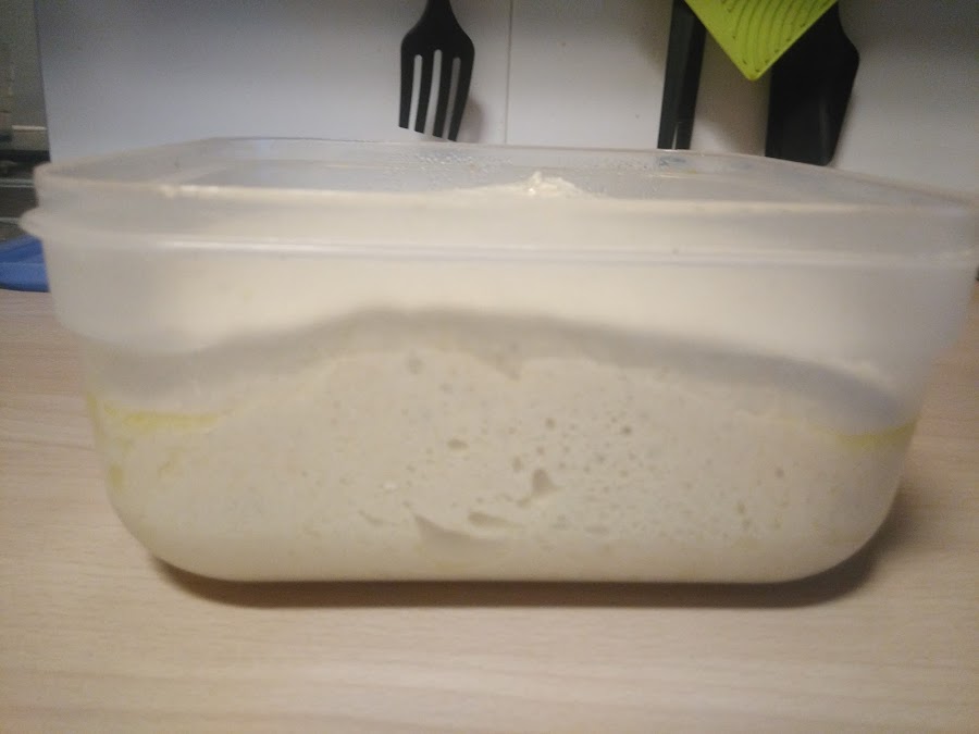 Dejaremos reposar hasta que haya aumentado de tamaño notablemente, pero sin que llegue a doblar del todo su tamaño, ya que nos interesa que llegue con fuerza al horno y nos crezca en él. Yo la tuve 1 hora y 30 min.