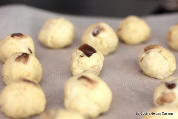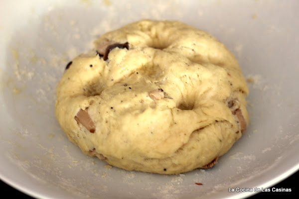Desgasifica (ya ves mis dedos clavados en la masa). Forma los bollitos e incorpora en una bandeja de horno cubierta con papel vegetal. Pincela con el huevo o con el aceite de pasas.