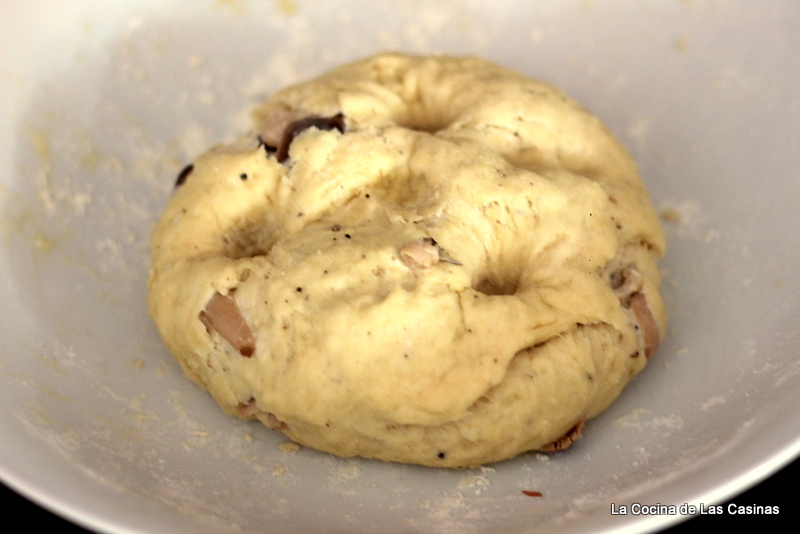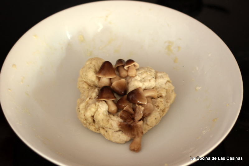 Rehoga las setas e introduce en la masa. No importa que se te salga alguna. Debe de reposar cubierta con un paño de cocina hasta que duplique su volumen.