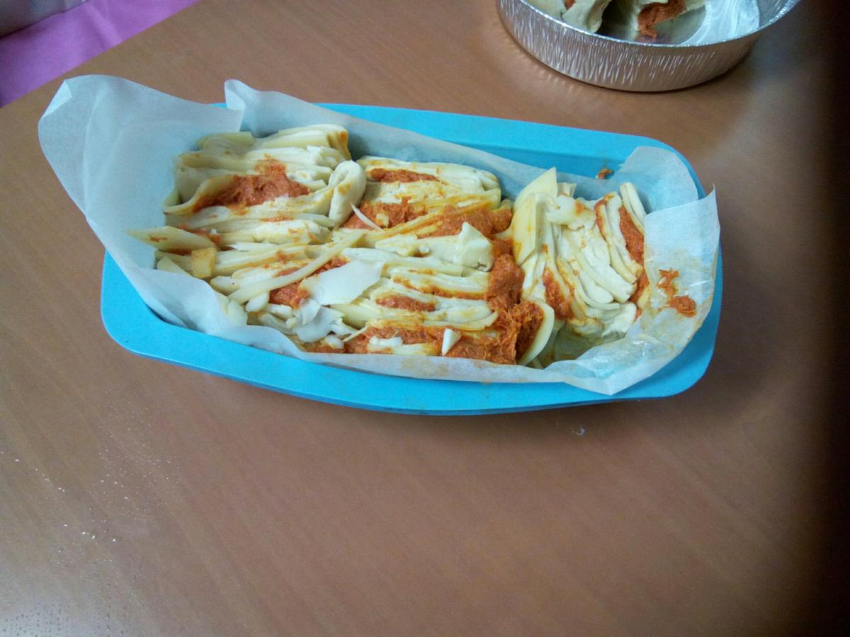 5.- Cortamos la masa en tiras de unos 8 cm y las colocamos unas encima de otras. Volvemos a cortar en rectángulos de 8x6cm. aproximadamente y los colocamos tumbados dentro del molde forrado con papel de hornear. Los colocamos tumbados para que se vean las capas y dejamos reposar dentro del molde otros 30 min.