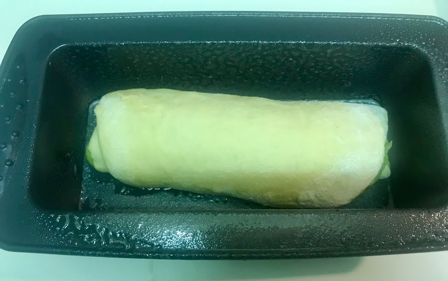 Coloca el rollo en un molde de cake de 1 litro de capacidad previamente engrasado y pinta la superficie con leche.