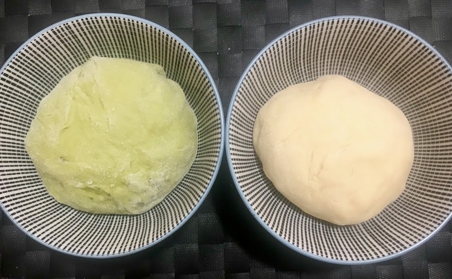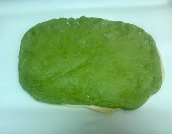 Con el rodillo, extiende la masa blanca hasta obtener un rectángulo de aprox. 18x30 cm. Extiende la masa verde hasta obtener un rectángulo del mismo tamaño. Pinta la masa blanca con leche y coloca encima la masa verde.