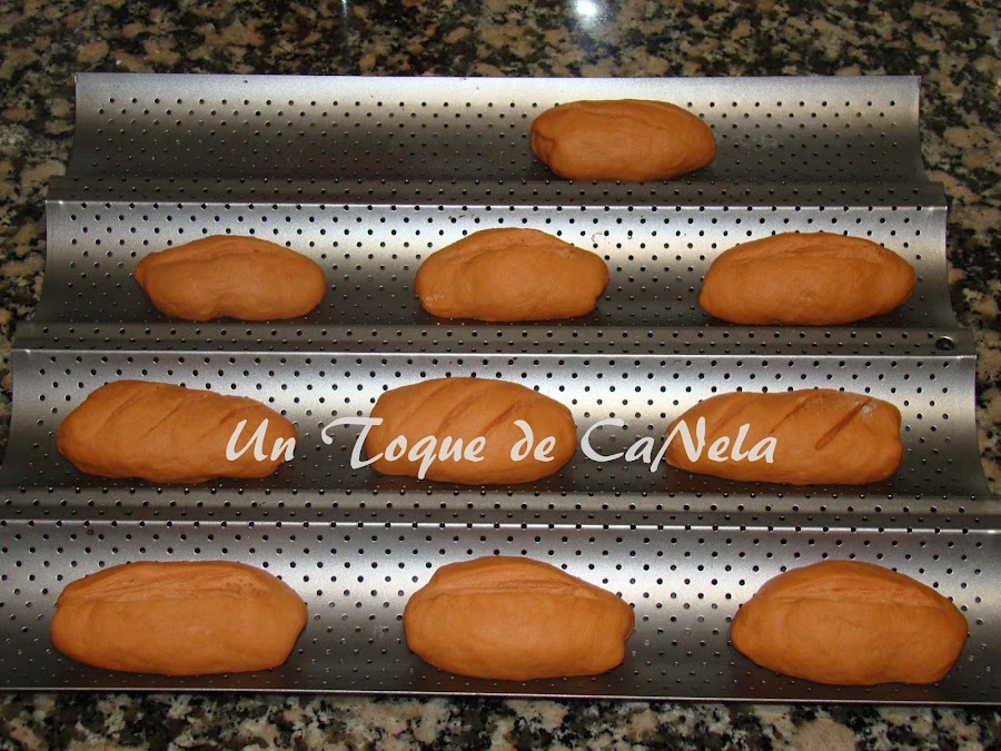 Desgasificar, hacer porciones de 30 gr., darle la forma deseada y poner en bandeja de horno con papel vegetal. En mi caso, en bandeja para hornear pan. Dejar levar de nuevo.