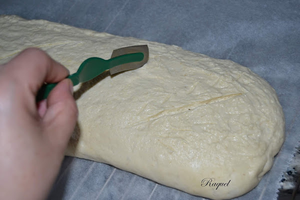Formamos el pan y hacemos unos cortes, no me quedaron muy bonitos pero el resultado de rico es el mismo.