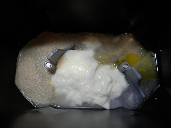 Prepara la cubeta de la panificadora, yo lo que suelo hacer es poner el aceite de oliva en las aspas para que no se peguen.