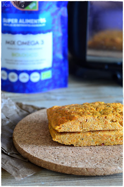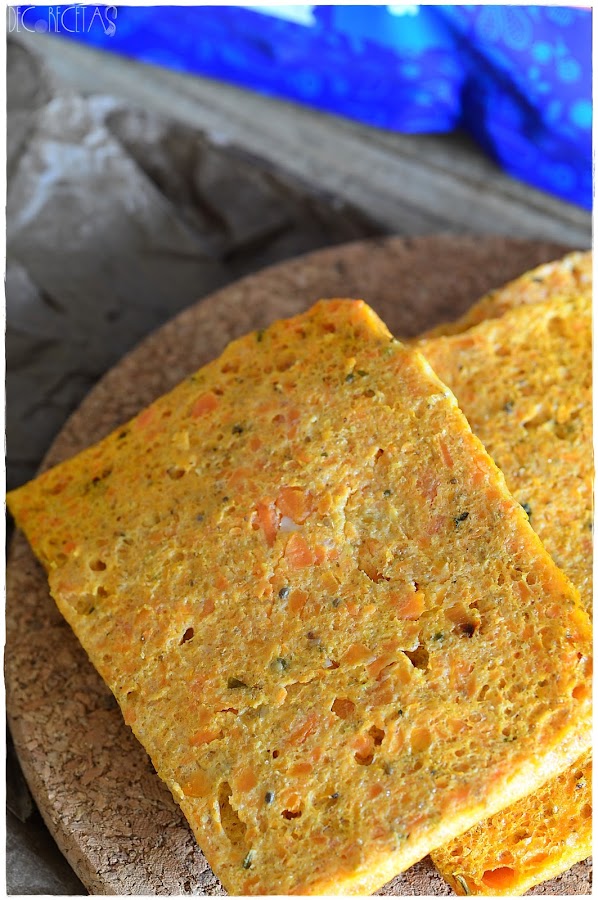 Trituramos dos zanahorias, agregamos 3 claras de huevo, media cucharada de levadura química, dos cucharadas de lino y chia triturados. Introducimos dentro de un molde engrasado y llevamos al microondas por 8 minutos a 800w. Desmoldamos, cortamos a la mitad y doramos en el tostador