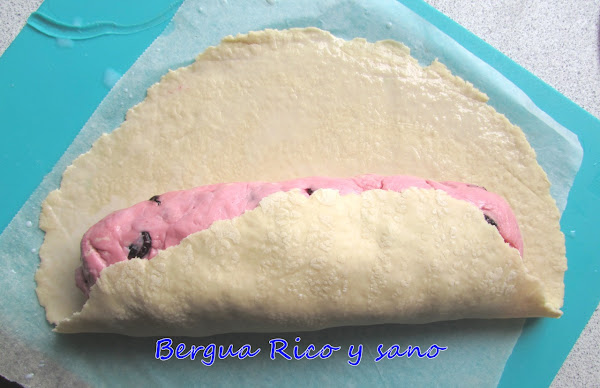 15. Colocamos el cilindro rosa en el centro de la masa blanca y lo envolvemos con ella, podemos ayudarnos del papel de horno para levantar la masa. Tenemos que asegurarnos de que quede sellado para que no se nos mezclen los colores al levar ni al cocinar.