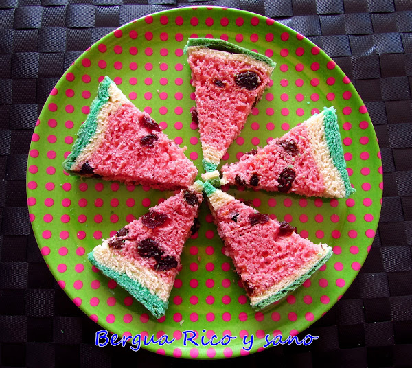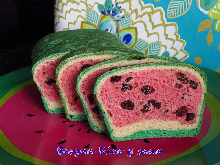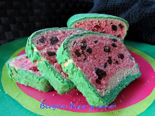 * Vale para sándwiches, para comerse una rebanada a media tarde con nutella o con mermerlada y queso, con jamón de pavo... Si das una merendola lo puedes servir solito en triangulitos, como si fuera sandía de verdad, y queda ideal con el resto del picoteo ;)