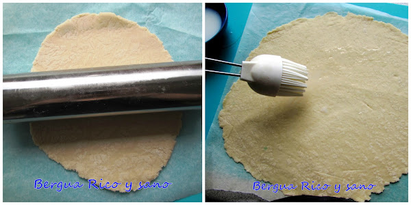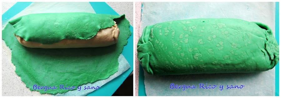16. Estiramos la masa verde y la pintamos con leche. Entonces enrollamos el cilindro blanco en el verde y de nuevo sellamos bien para que no se mezclen las masas.