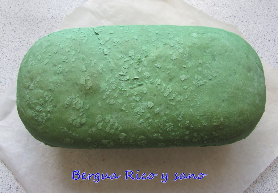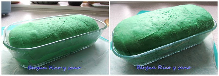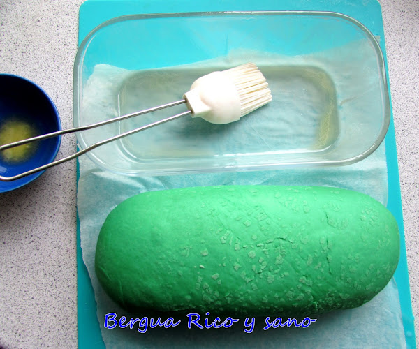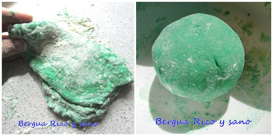 10. La amasamos durante 6-8 minutos sobre el mostrador como hicimos con la rosa. Hacemos una bola con la masa verde, cubrimos el cuenco y la dejamos levar también.