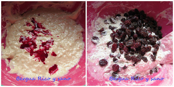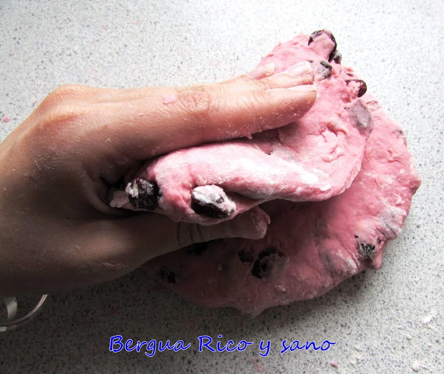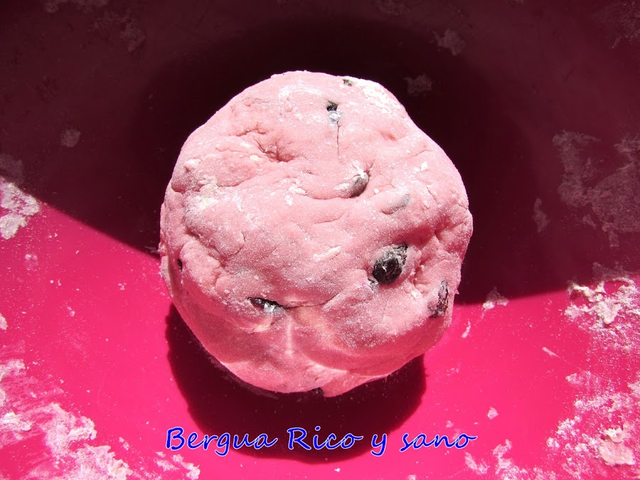 6. Mezclamos entonces con las pasas, que serán las pepitas de la sandía. Añadimos más harina de la que teníamos reservada y mezclamos. Tiene que quedar una textura menos húmeda que podamos manejar.