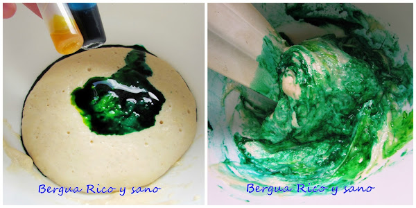 9. Seguimos con la corteza de la sandía. Tintamos de verde uno de los cuartos de masa que habíamos apartado. Si no tenemos verde mezclamos azul y amarillo como yo hasta que nos guste el tono. Mezclamos y añadimos un poco más de harina de la que habíamos reservado hasta poder trabajar la masa.