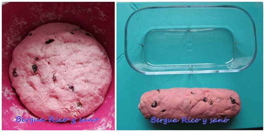 12. Pasadas las 2 horas, la masa habrá doblado su tamaño. Apretamos la masa rosa para deshacernos el exceso de aire. Le damos forma cilíndrica del largo del recipiente que vayamos a usar. El mío es un recipiente alargado de cristal para horno y las medidas son 23,5x12x6 cm.