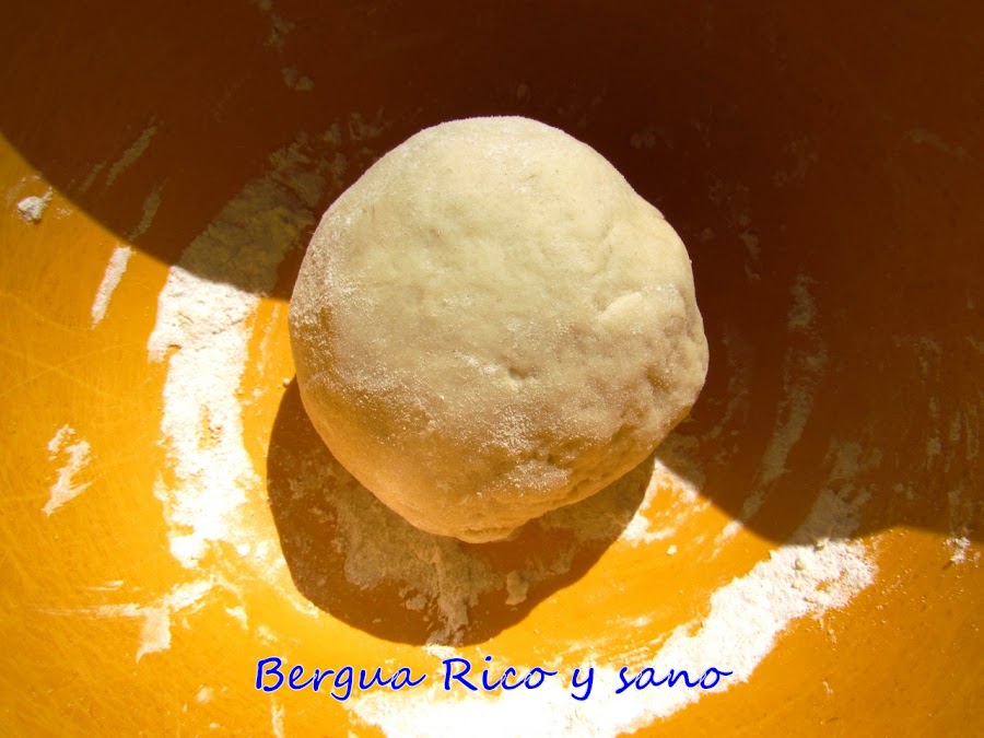 8. La hacemos una bola, cubrimos el cuenco con papel transparente o con un paño y ponemos la masa a levar durante unas 2 horas; dependerá de lo caliente que esté la cocina. Yo precaliento el horno durante un rato y cuando la masa está lista, apago el horno y el cuenco con la masa lo pongo sobre el horno, pero fuera de él. Así sólo le llega calor residual de la superficie.