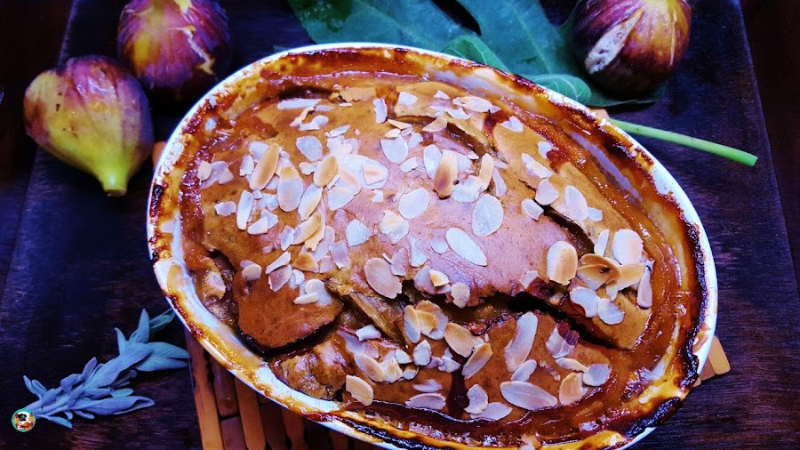 3.-Engrasamos un molde con margarina. Esparcimos por encima un poco de azúcar morena. Lavamos bien las brevas, las secamos con papel de cocina y las cortamos en gajos, cubrimos el fondo del molde con la fruta. Vertemos la masa sobre la fruta hasta cubrir por completo, ponemos una capa de brevas cortadas y vertemos el resto de la masa cubriendo toda la fruta. Esparcimos por encima las laminas de almendras. Precalentamos el horno a 175ºC y cocinamos el pan 60 o 70 minutos, hasta que este bien hecho por dentro y muy crujiente por fuera.