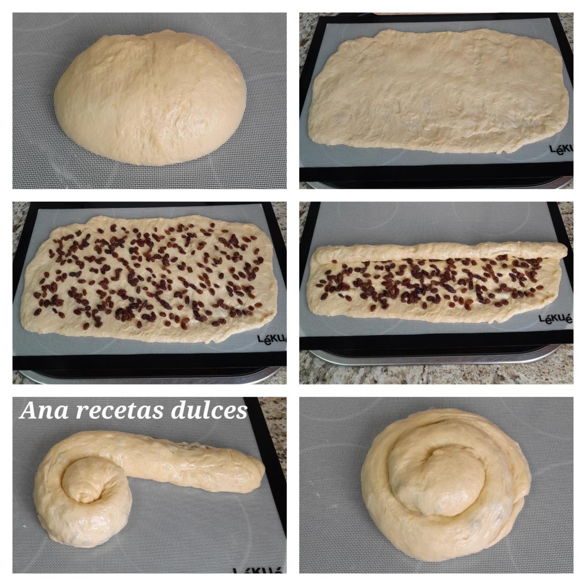 Estiramos la masa en forma de rectángulo y esparcimos las pasas maceradas bien escurridas por toda la superficie, enrollamos la masa formando un cilindro y volvemos a enrollar formando un círculo, tapamos con un paño y dejamos reposar de 10 a 15 minutos.