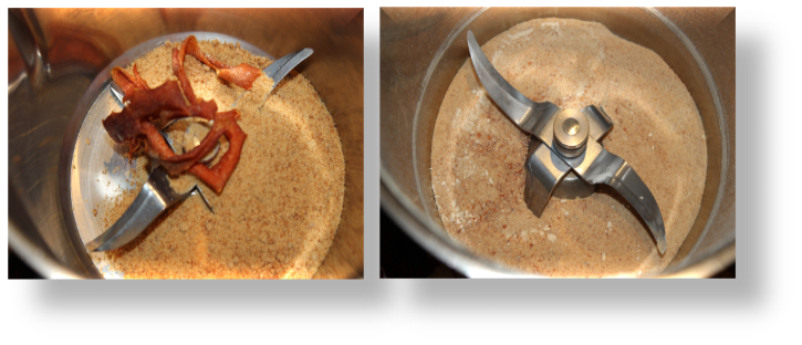 Añade al vaso el azúcar panela junto con la piel de una naranja (sin la parte blanca). Cierra el vaso y pon el cubilete. PULVERIZA 10 SEG. / VEL. 10. Comprueba si la piel está bien molida. En mi caso al poner piel de naranja seca, ya que no tenía naranjas, tuve que rallarlo 3 veces hasta conseguir una textura fina.