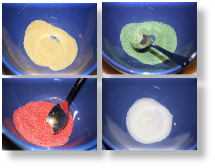 Elige cuatro bols y pon 1 cucharada de azúcar en cada uno de ellos. Añade un poco de colorante alimentario. Mezcla con una cuchara.