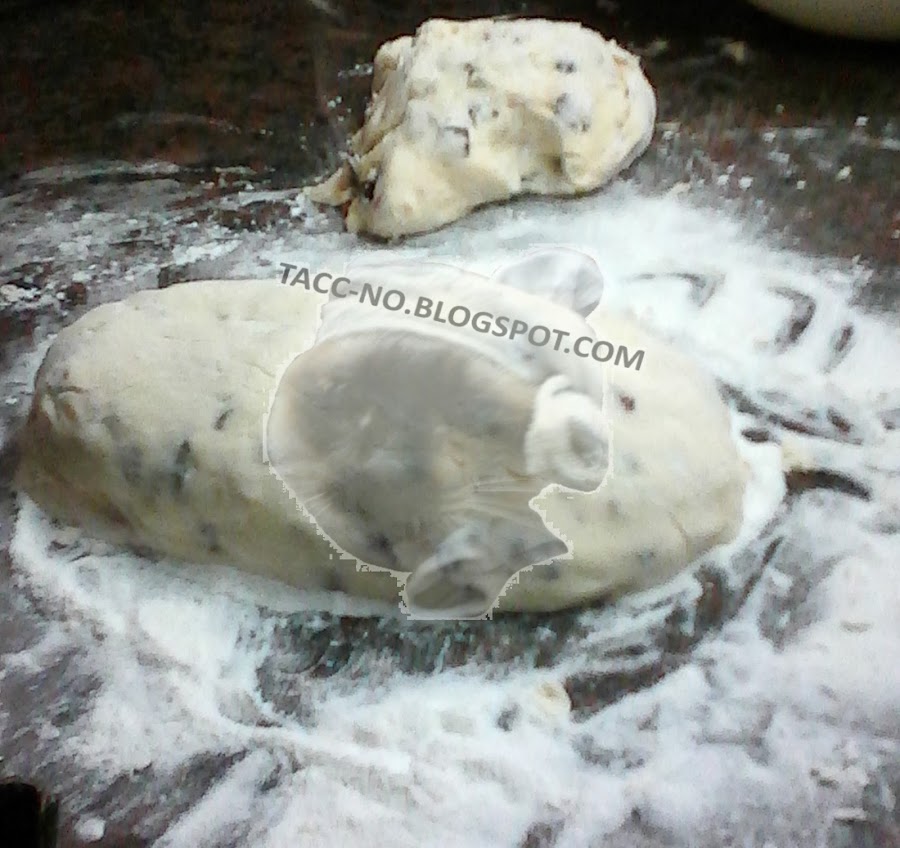 En la mesada espolvorear algo de harina o cualquiera de los almidones y poner encima la masa. Aplastar un poco y agregarle las frutas secas y abrillantadas (o sólo frutas secas o chocolate o lo que prefieran).