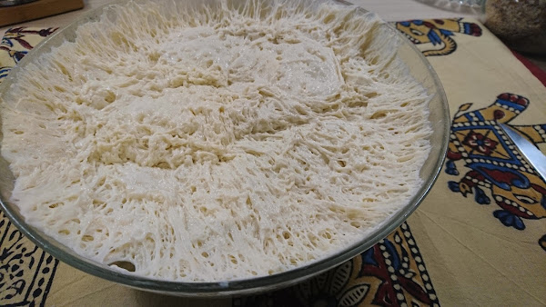 Tapamos con papel film el bol y lo dejamos reposar a temperatura ambiente 12 horas, que la levadura vaya dándose el gran atracón y disfrute de la vida. NOTA: En este caso conviene dejar preparada la mezcla la noche anterior y por la mañana ya la tendremos crecidita.