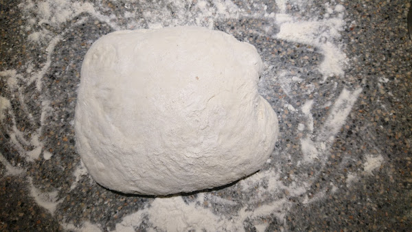 Espolvoreamos bien de harina la superficie de trabajo (la encimera, una barra... pero que ante todo esté super limpia) y volcamos la masa ayudándonos con la cuchara. Nos "manchamos" un poco las manos con harina para manipular la masa.