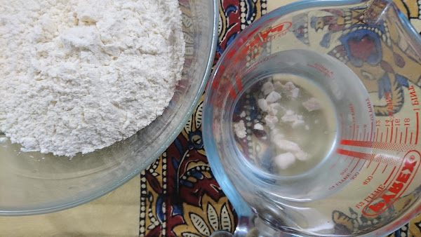 Disolvemos bien la levadura fresca en el agua. NOTA: El agua que esté tibia. Si tenéis termómetro a unos 20º-25º. Si no tenéis a dedo limpio, ni fría en plan granizado ni caliente estilo sopa de cocido.
