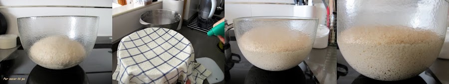 Finalizado el amasado formamos una bola y la colocamos en un bol. Tapamos con un paño de algodón limpio y rociamos agua con un spray, con ello ayudamos a conservar la humedad de la masa y que no se reseque. La colocamos en un lugar cálido de nuestra cocina y que no tenga corrientes de aire. La dejamos reposar hasta que doble su volumen, milagro que suele ocurrir, dependiendo de la temperatura, en un plazo de unas dos horas más o menos. Es el primer levado de nuestra masa.