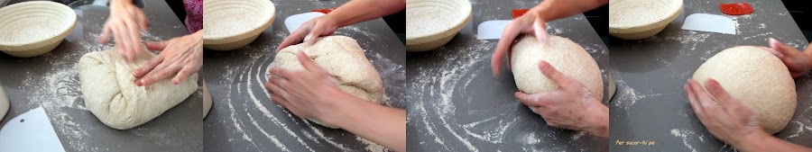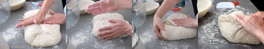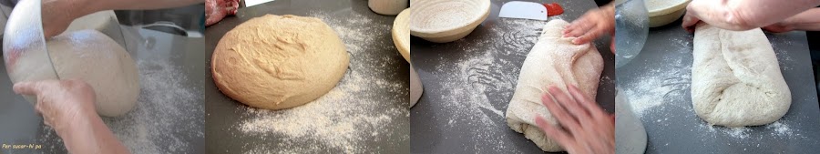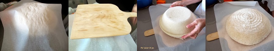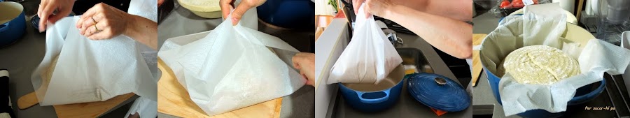Hay que colocar la masa dentro de la cazuela supercaliente, rápidamente y sin quemarse! Para ello cortamos un trozo grande de papel de horno, lo colocamos encima de la masa y la volcamos sobre la superficie de trabajo. Sacamos la cazuela del horno con unas manoplas consistentes y la dejamos sobre un corcho o similar. Unimos las cuatro puntas del papel de horno, levantamos la masa y la colocamos dentro de la cazuela. La parte de arriba es la de los pliegues de la etapa de formado, lo que hará que el pan greñe (se abra) de forma natural. Si colocáramos arriba la parte lisa de la bola, tendriamos que hacer unos cortes, con un instrumento afilado, para lograr ese efecto, y en este caso podríamos "dibujar" el acabado final del pan.