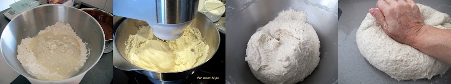 El proceso se inicia con la mezcla de todos los ingredientes. Utilizo un procedimiento mixto: la mezcla y el amasado inicial con un robot de cocina, y el amasado final, hasta completar un tiempo total de unos 10 minutos, a mano. De esta manera se controla mejor el punto final de la masa, obteniendo la textura y elasticidad deseadas.