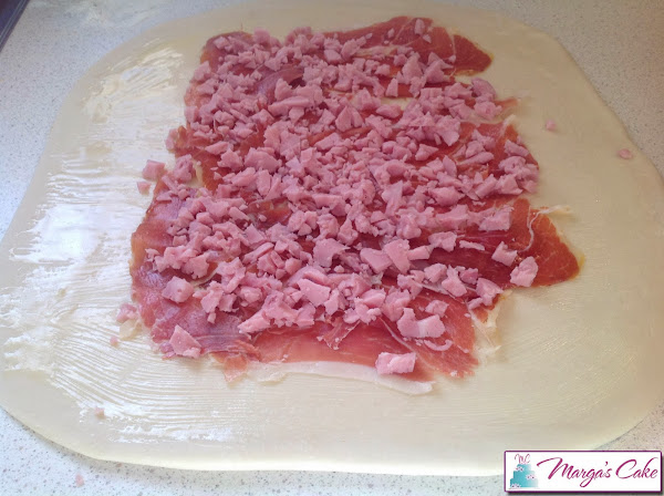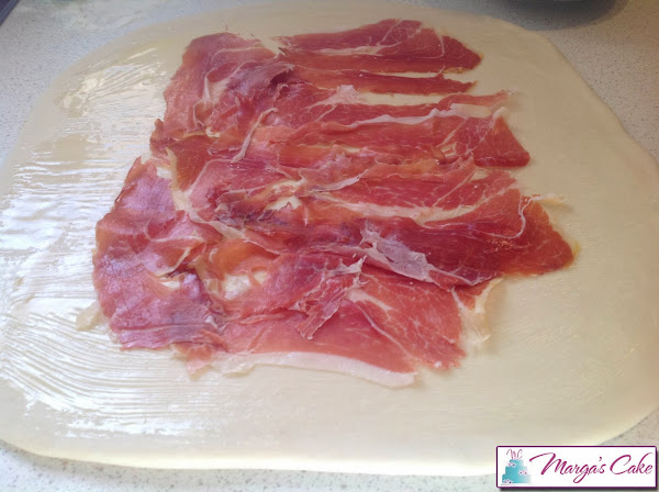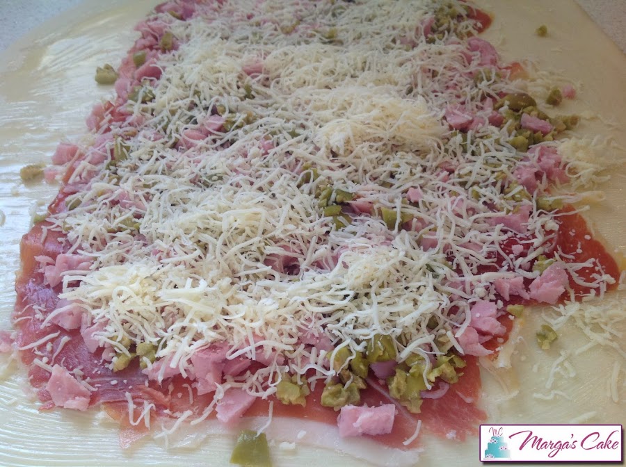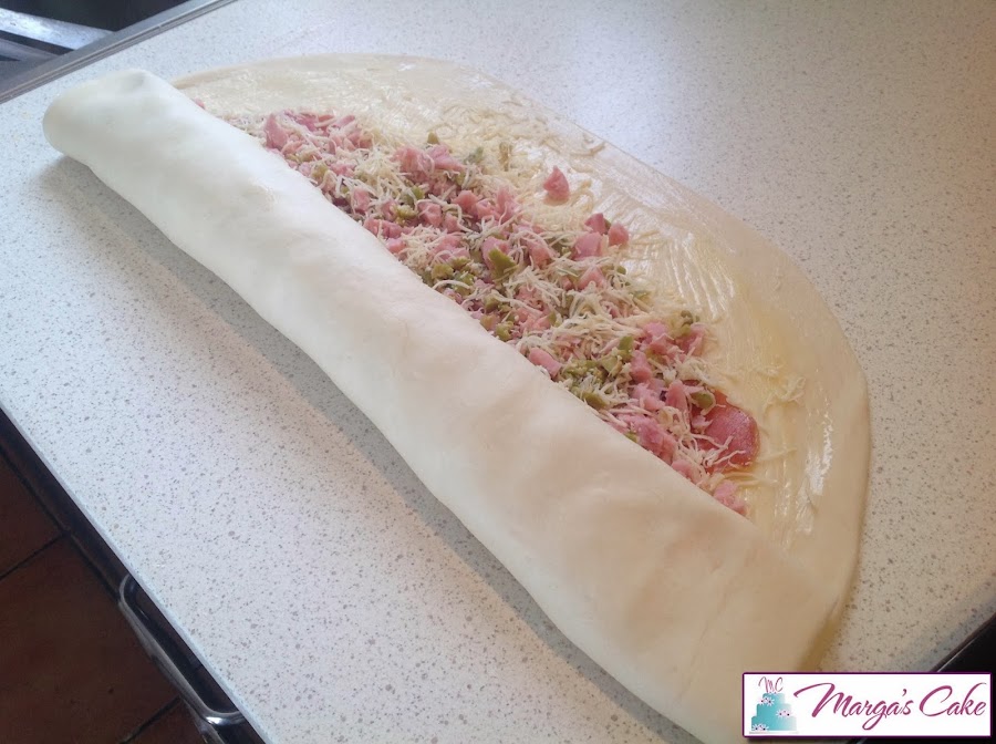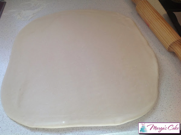 Sacamos la masa, la estiramos y seguimos con el procedimiento para darle forma y añadirle los ingredientes que la entrada a modo normal sin máquina.