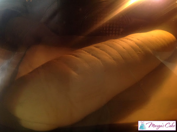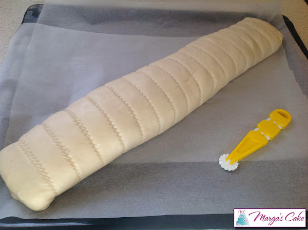 Una vez enrollado meter las puntas de este hacia abajo por estética, marcamos con un cortador de pasta de rizo y dejamos que repose 1 hora mi truquito, es que lo meto en el horno al mínimo 50 grados y dobla su volumen muy rapido, pasado este tiempo sacamos del horno y recalentamos a 180 grados diez minutos e volvemos a introducir el pan en la bandeja del horno con papel sulfurado de 30 a 40 minutos horno arriba y abajo.
