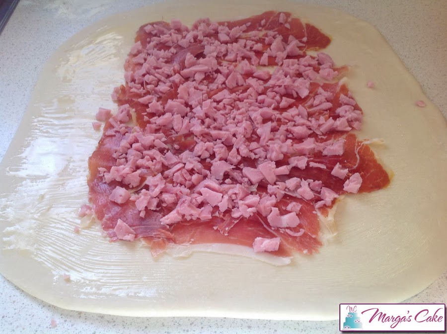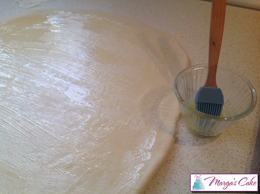 Estiramos bien en forma rectangular ayudándonos del rodillo con una medida de unos 40 x 33 cm. Pintamos con los 50 gr de mantequilla derretida sin llegar a los bordes, para después sellar bien.