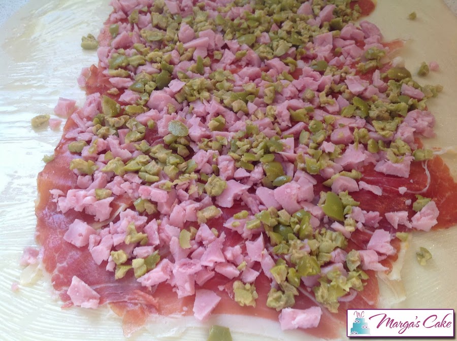 Vamos poniendo encima las lonchas de jamón serrano, seguimos con el jamón york picadito, las aceitunas picaditas, las alcaparras y pasas.