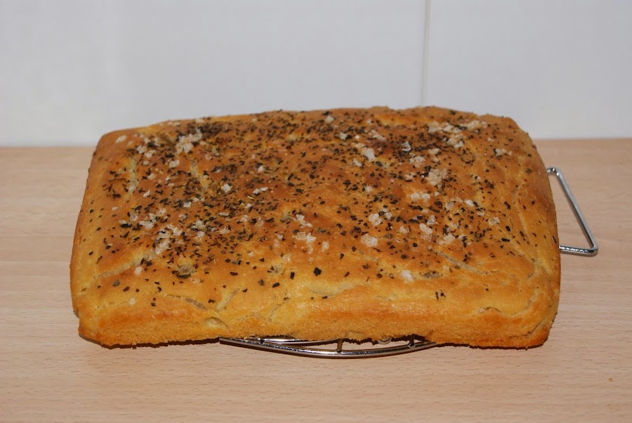 Untamos con aceite un molde y ponemos la masa bien extendida. Hacemos huecos con el dedo y ponemos el orégano, la albahaca, el resto del aceite y sal. Volvemos a tapar y lo reservamos mientras calentamos el horno a 180º C. Horneamos 35 minutos y listo.